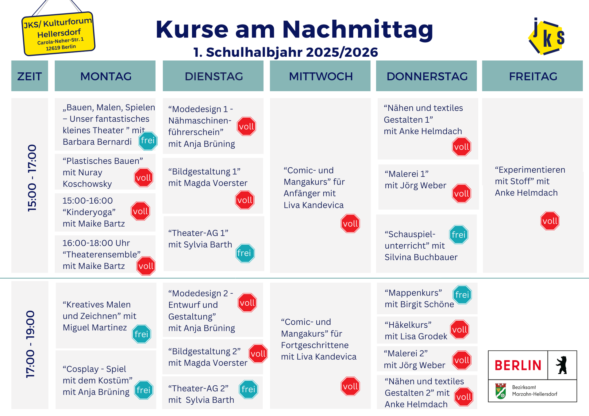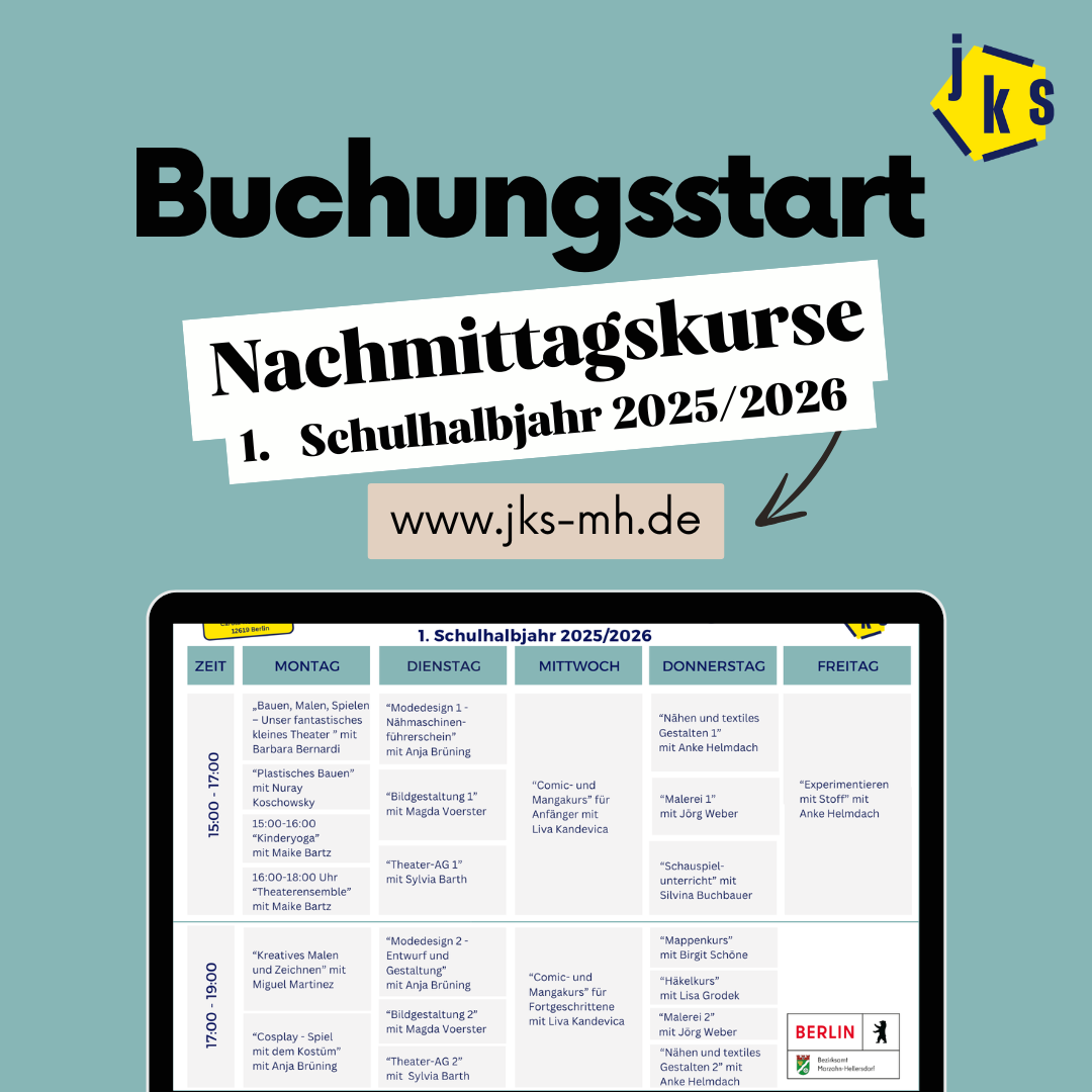 Wir freuen uns darauf, dich ab kommender Woche in der Jugendkunstschule Marzahn-Hellersdorf begrüßen zu dürfen!