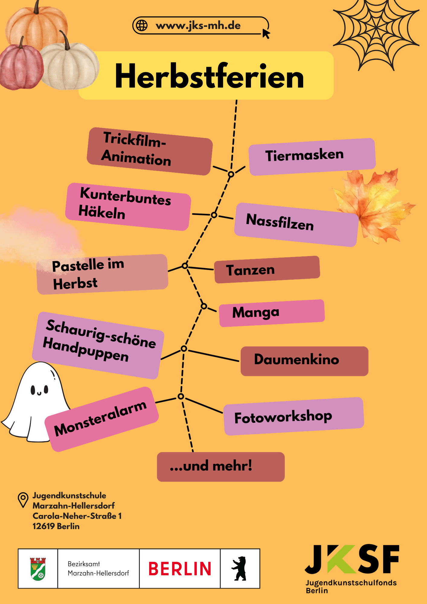 In der gemütlichen Herbstzeit laden wir alle Schulkinder und Jugendlichen ein, mit kreativen Projekten Farbe in die grauen Tage zu bringen. Ob Trickfilm-Animation, Manga zeichnen, schaurig-schöne Handpuppen basteln, Pastellmalerei, Tanzen, Daumenkino gestalten, Monsteralarm erleben oder viele andere tolle Angebote – bei uns ist für jede*n etwas dabei!