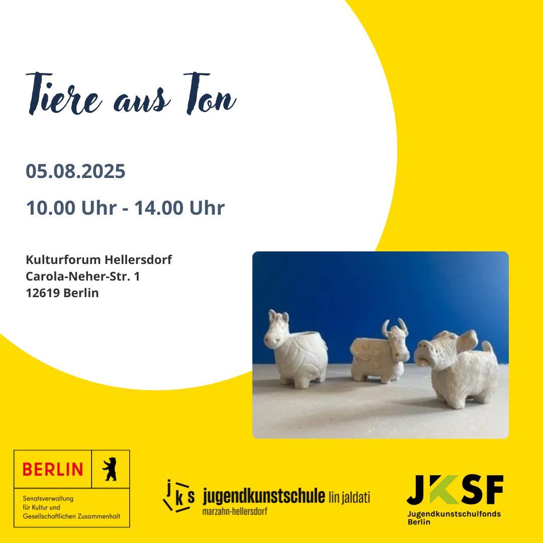 Aufgrund der großen Nachfrage, haben wir einen weiteren Ferienkurs zum Thema "Tiere aus Ton" am 05.08.2025 von 10-14 Uhr ergänzt.