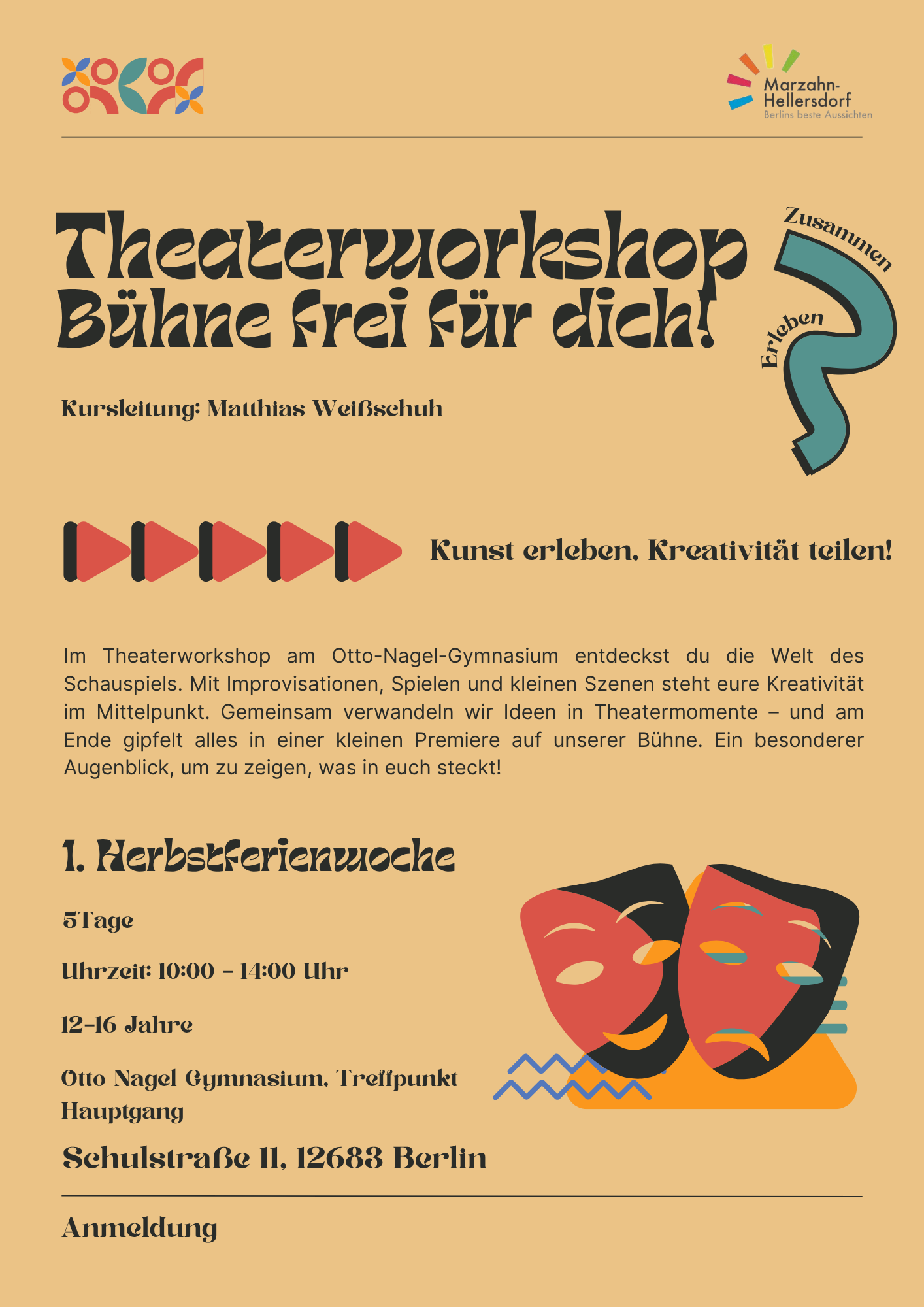 Im Theaterworkshop am Otto-Nagel-Gymnasium entdeckst du die Welt des Schauspiels. Mit Improvisationen, Spielen und kleinen Szenen steht eure Kreativität im Mittelpunkt. Gemeinsam verwandeln wir Ideen in Theatermomente – und am Ende gipfelt alles in einer kleinen Premiere auf unserer Bühne. Ein besonderer Augenblick, um zu zeigen, was in euch steckt!