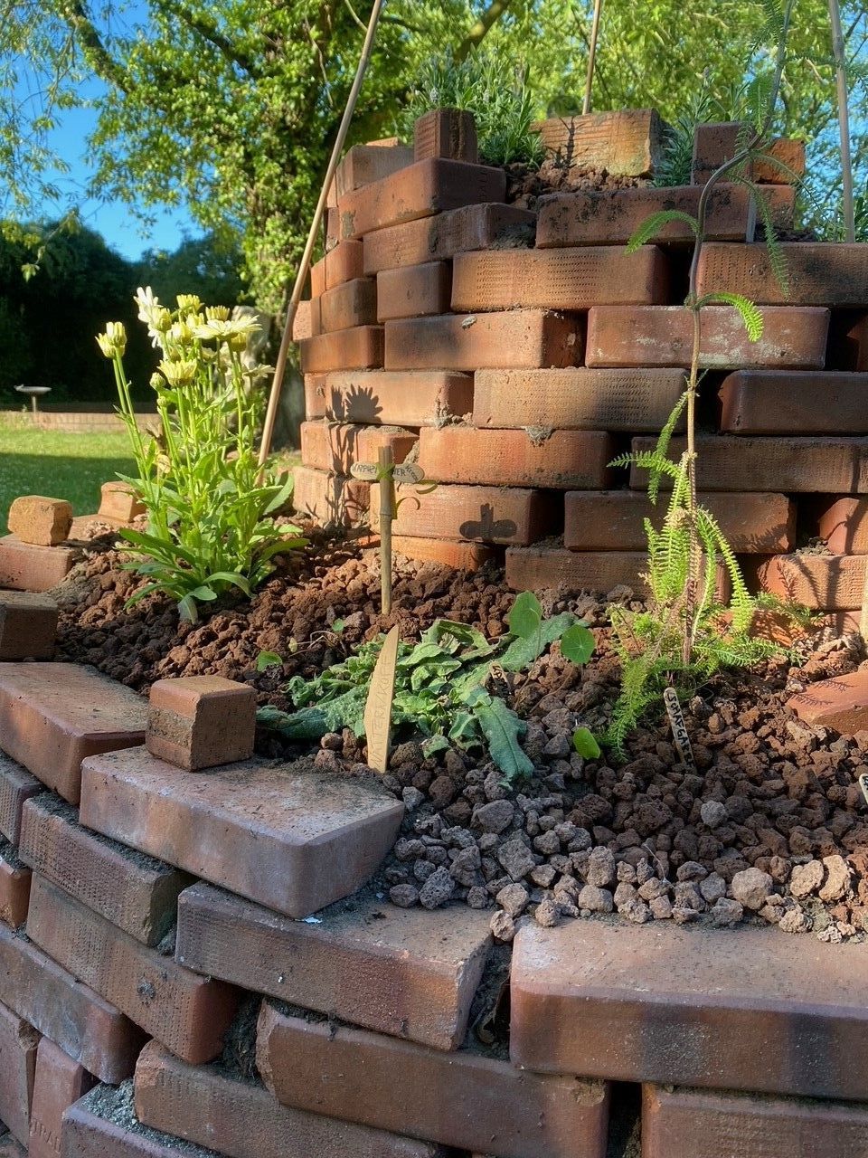 Diese Kräuterspirale dient nicht nur als Lehrgarten, sondern auch als Ausstellungsfläche für Miniaturobjekte und als Inspiration zum Zeichnen. Aus verschiedenen Perspektiven betrachtet, erinnert sie an den Turm von Babel, ein Rad oder sogar eine kleine Festung.